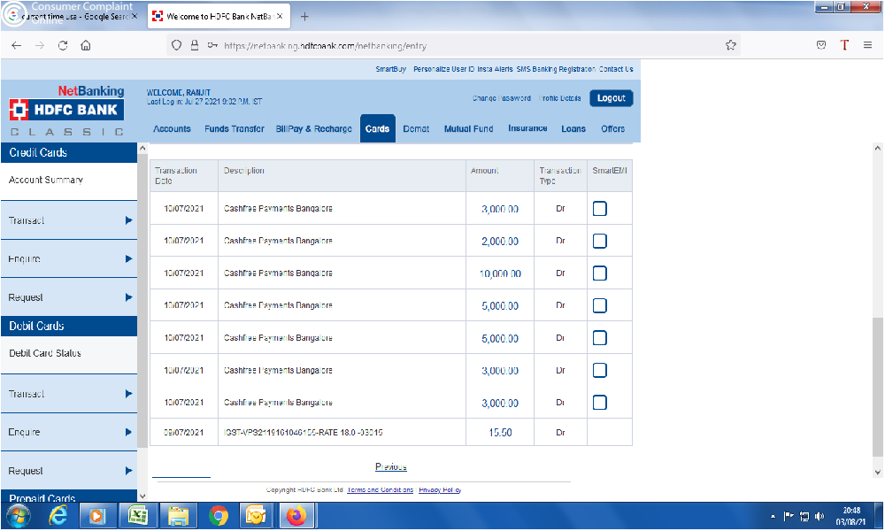 Refund request. Total amount debited from my account is Rs 20000/-.Enclosed are copies of such as a police report and bank statement supporting my position. Please invest this matter and correct the fraudulent debit as soon as possible