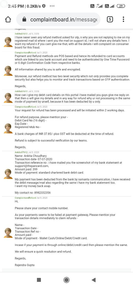 I have applied for the pan card on this website 'www.thepancard.com', after filling the form and completing all the procedure , i have paid Rs. 399 for the same from my debit card. Payment has been successfully deducted from my bank account , i have received deduction sms & email from my bank for the same & it is showing in my bank statement too. But after the deduction of the payment, i have never received any confirmation from the website through email or sms for confirming my payment , not received any transaction no./ Request no. Etc, Even when i am trying to check status of my pan card on the website, it is saying no pan card request received, there is no customer support details available on the website, there is one form for submitting a request to customer care i have tried that 100 times but no response received. i have tried mailing them with all the proof of deduction on the id mentioned 'support@pancard.com' but no response received from any one. I