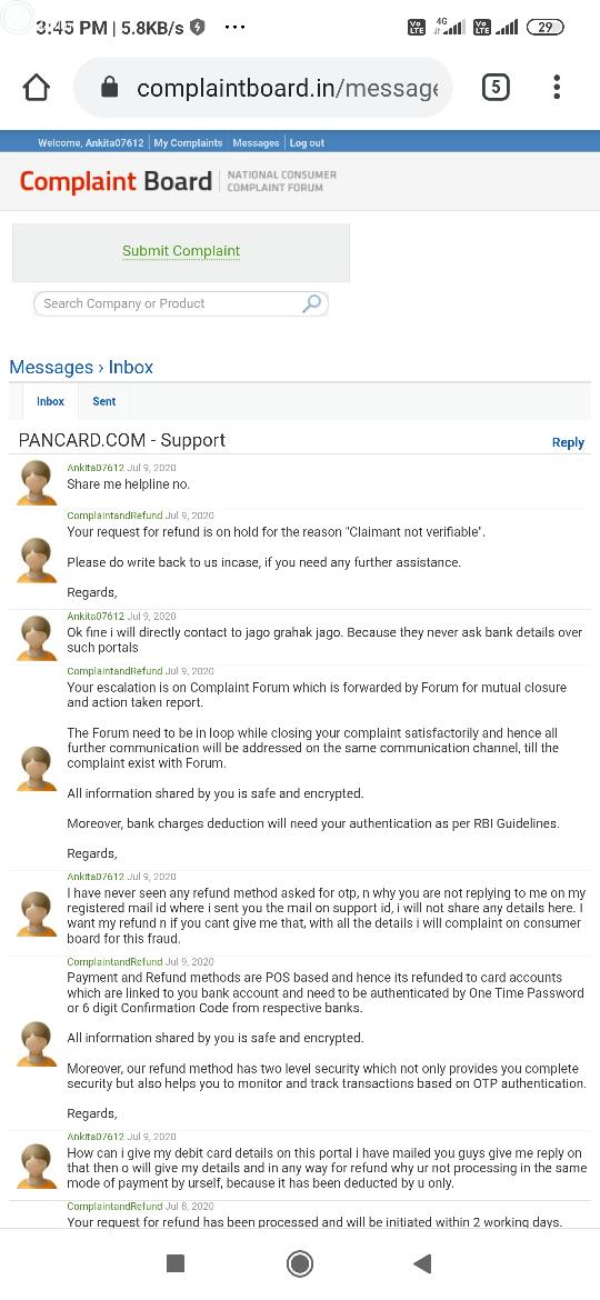 So i made complaint 'www.complaintboard.in' for the same. After the complaint i have received response from complaint board and they are saying to process your refund we need your debit card no. & Expiry date of the card by which you made the payment and OTP. I refused for that as it is prohibited by RBI to share such details even bank never ask for such details so i can't understand why they are asking such details for providing refund, this details are required to pay not for refund.