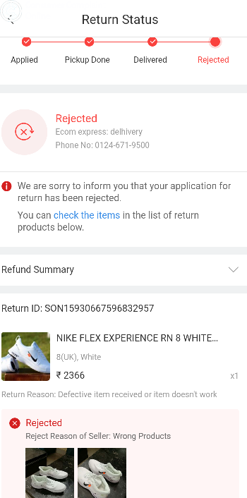 Dear Sir, I order a Nike Flex Shoe price is Rs. 2366/- and order no is SO283710913. When I recy the item, both pair are left side shoes then I return the same shoe. Return application no is SON15930667596832957 my return item rejected due to the return parcel didn't pass the quality check.