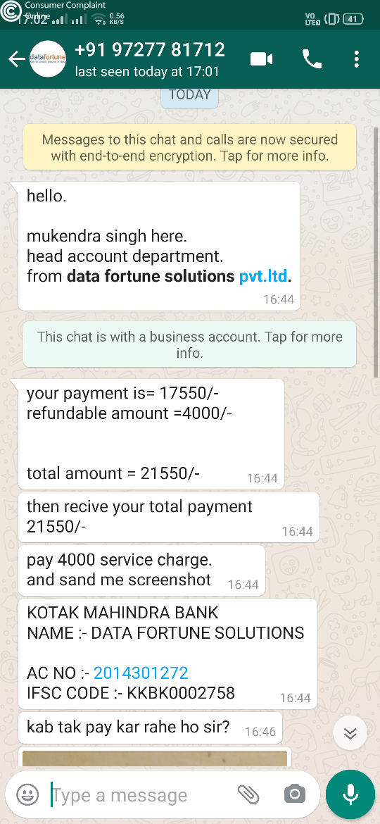 Company ne pahle mujhse data entry ka kam karaya mujhe yah bataya ki 25 rupaye per paragraph aapko milengeaur saat din mein aapko 800 paragraph complete karne padenga vah humne pure kar diye uske bad unka call aaya aapko 4000 rupaye pahle jama karne padenge uske bad aap ki salary milegi per Jaise humne inko payment ki uske bad se yah phone nahin utha rahe Na kuch kar rahe Jo humne rupaye diye the vah bhi wapas nahin kar rahe