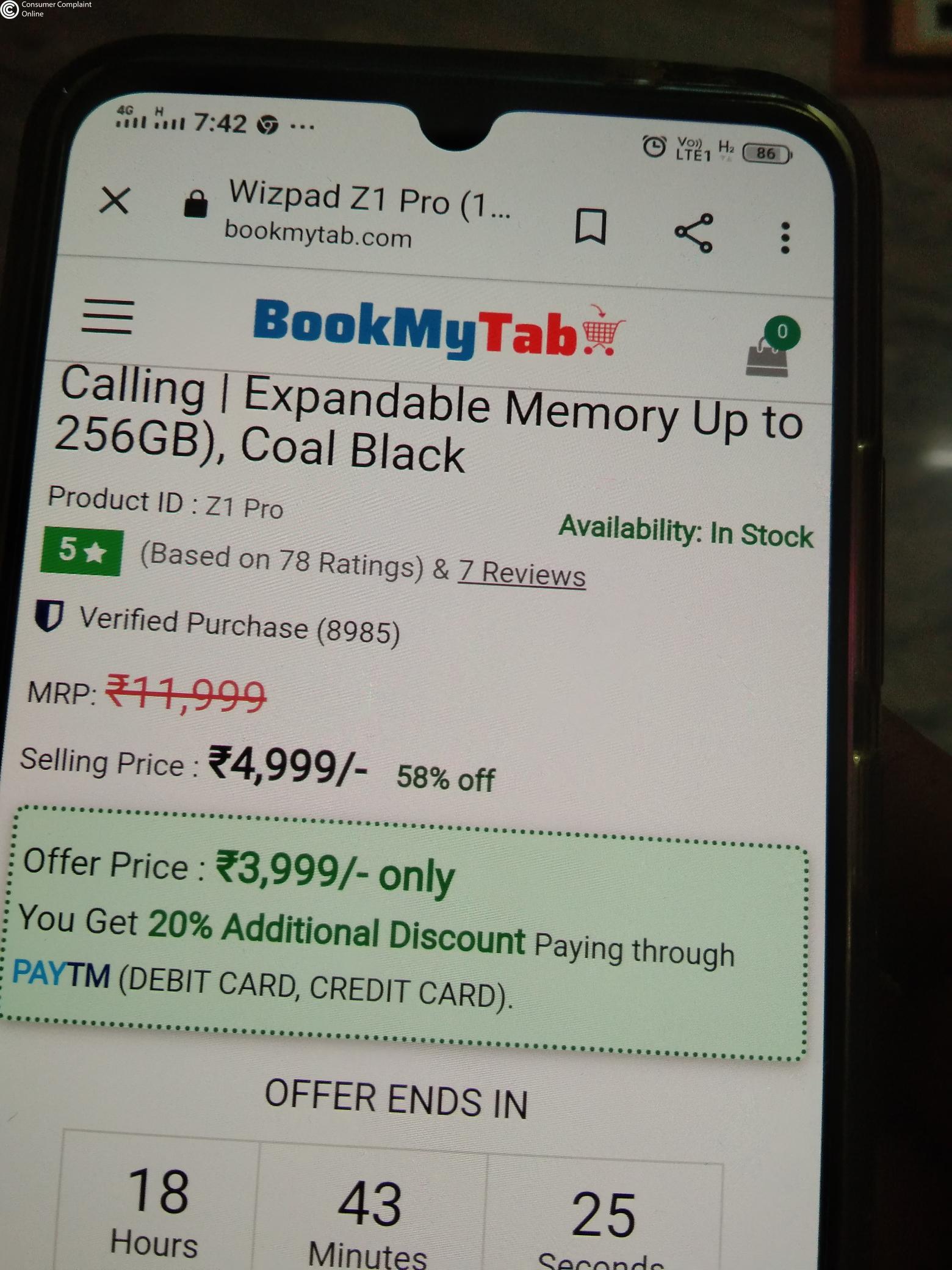 Book my tab website has cheated us . That they have shown us a branded wizpad z1pro tab but we have resived a local old second handed tab. Even the company name and brand name. Even there is no return option in this website. The tab is even not get operated it as not get on till now. Where we have charged it for 1-2 hours. We've lossed3999. Please give us justice.