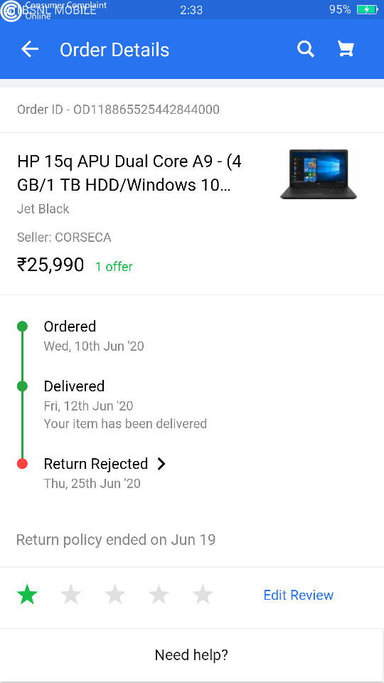 But two days later they removed the order details from my order section. When I called and asked about the product , they took time for 72 hours, after 72 hours, they again took time for 48 hours, and after 48/hours they mail us for the bank details as they said that they will refund within 24 hours , now its been 12 days and they are still not refund payment, and my credit card bill generated including the amount of EMI. which I have to pay, Flipkart in not responding properly. And said the problem is from seller, I respond that we dont know about the seller , we ordered from flipkart not with seller,