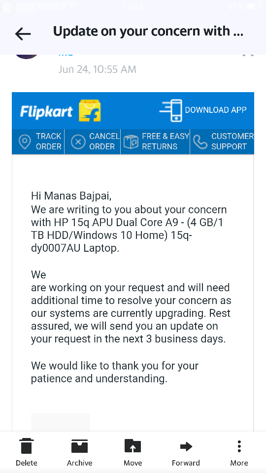 I call Flipkart more than 20 times but Flipkart not resolve my broblem. I got same mail from Flipkart.