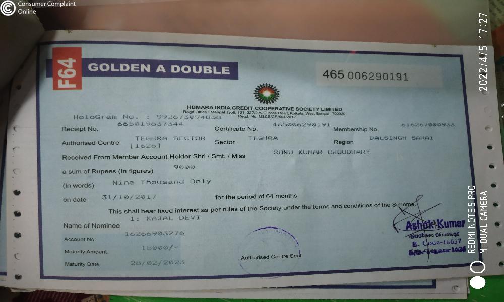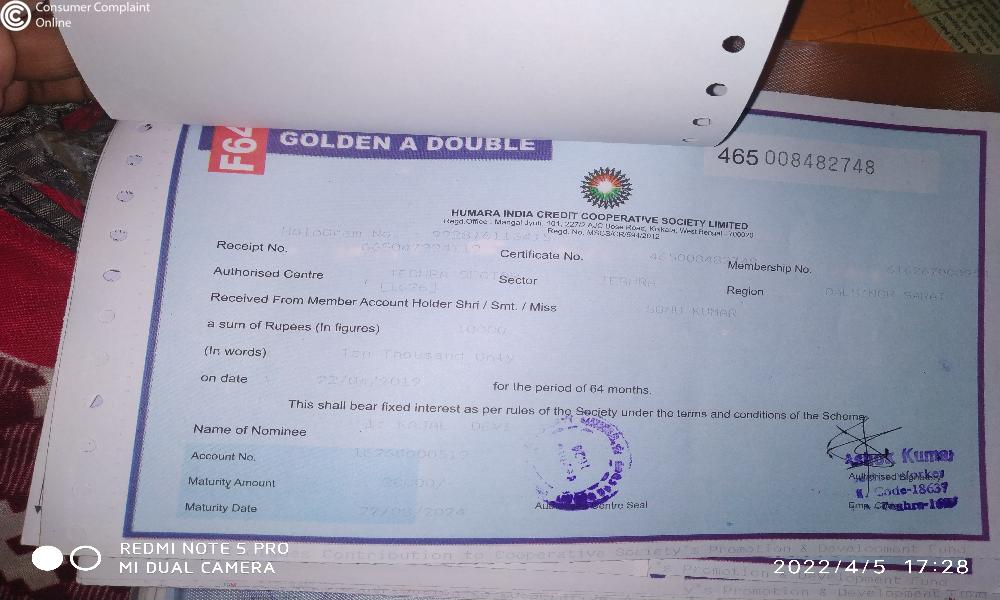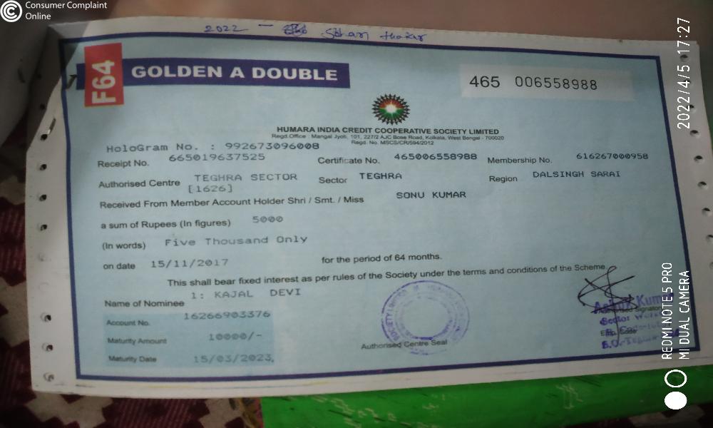 However, even after the maturity date and in spite of repeated telephonic request my Maturity Bond is still not realized. Even though, my maturity date is expired way back ------------------------------------. This is absolute breach of Trust and fraud from Humara India Credit Cooperative Society to poor citizen of this country.
