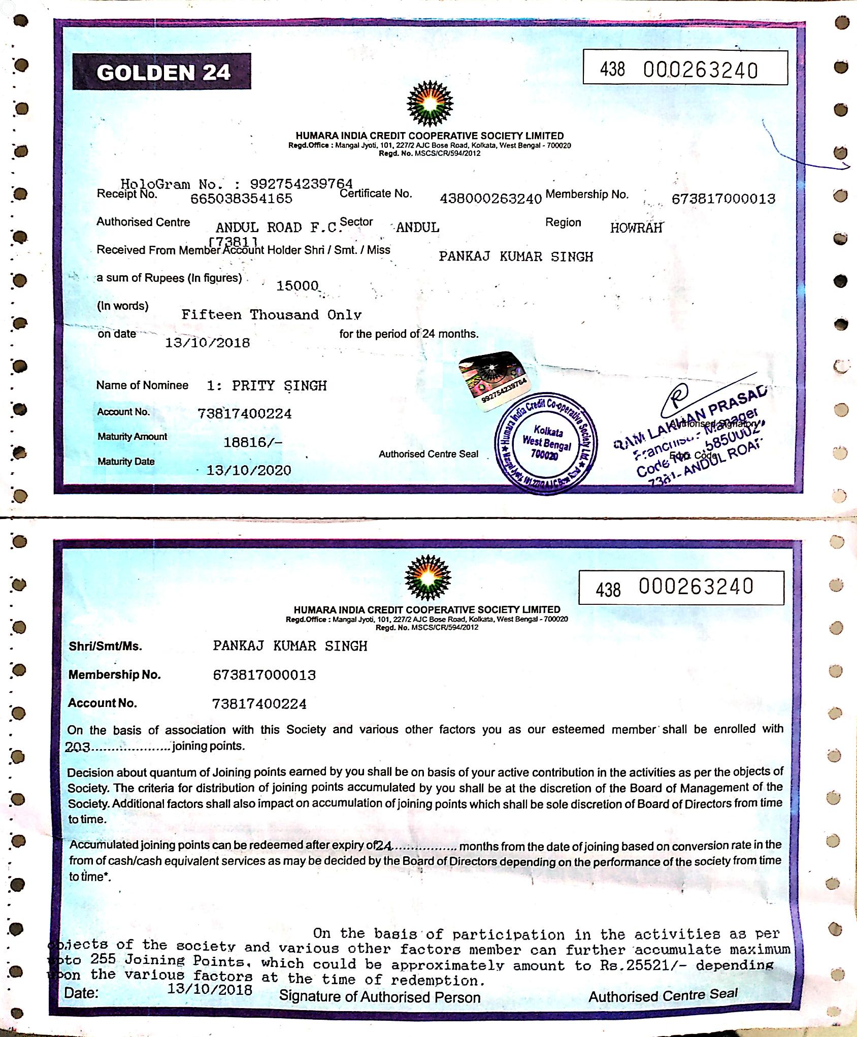 1: Amount=10900 Date=17/10/2018 Maturity date =17/10/2020 Plan=golden 24 Accountno=24137402215 2: Plan golden 24 = Amount = 13900 date=17/10/2018 Maturity date =17/10/2020 Account no=24137402216 3: Plangolden24 Amount=15000 date=17/10/2018 maturity date=17/10/2020 Account no=24137402217 three account no deposite Dinesh bhagat please maturity payment karne kaa kirpaa kare
