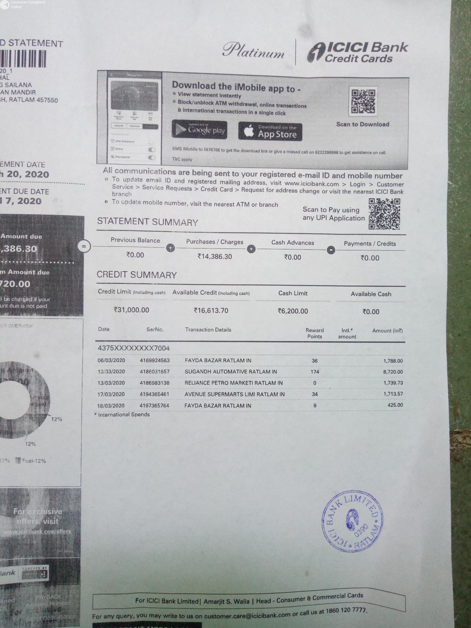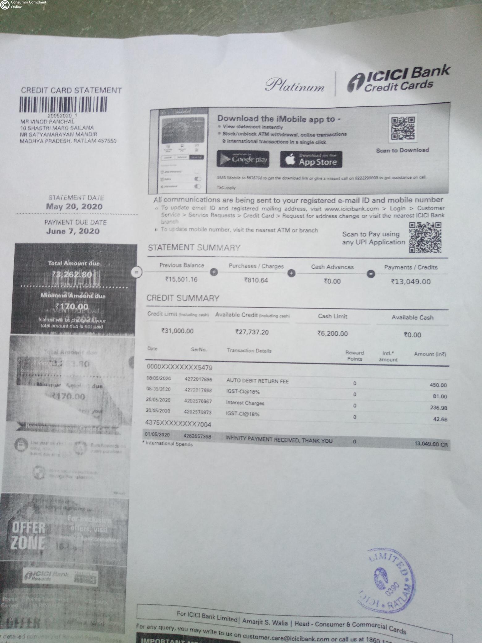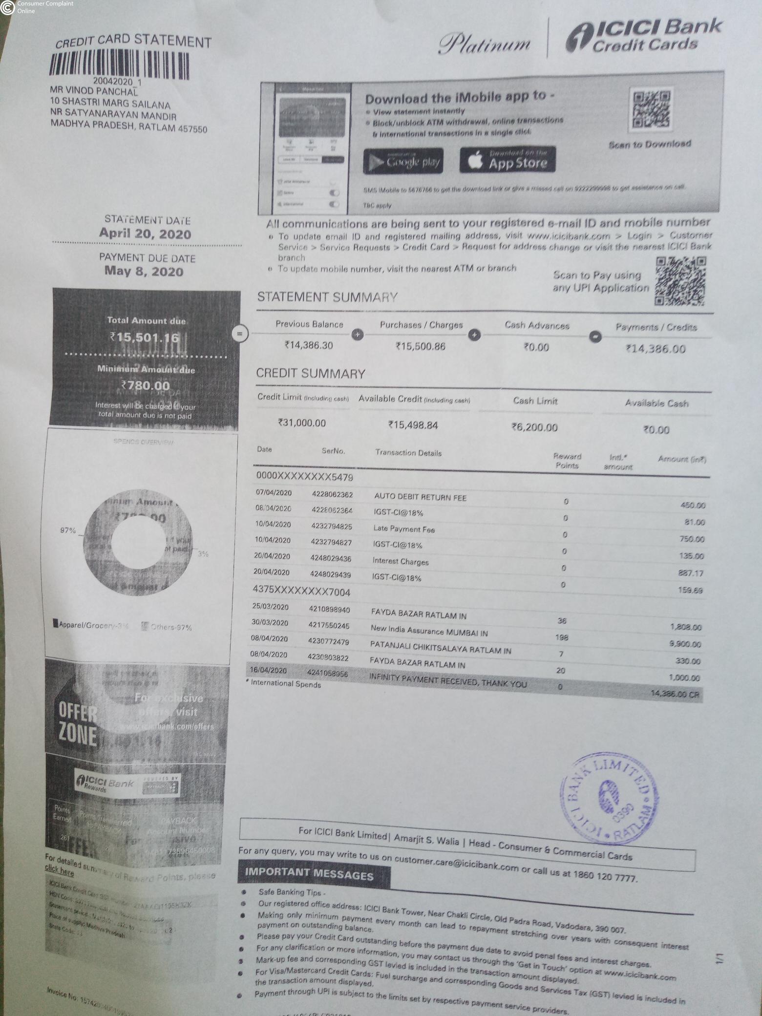 Mera nam vinod panchal h. Mughe icici karmachari ratlam (m. P.) dwara credit ka k liye apply kiya gaya tha. Credit card mughe 6/03/2020 ko by post sailana se prapt huaa. Lekin card activate 21/02/2020 ko hi kr diya gaya. Aur mughe credit card payment kaise kare sambandhi koi jankari nahi di gai. Lockdown k darmiyan 16/04/2020 ko icici karmachari ka phon aaya ki aapka credit card bill 14386 shesh h. Mene unse kaha payment kaise karna h to unhone bola icici ki imobile download se karde. Mene 16/04/2020ko hi payment kr diya.. Phir mese shesh amount ka bhugatabn b 02/05/2020 ko 13049 ka kar diya jo mere dwara credit card se pArches kiya gaya tha. Kintu mere cridit card me panlty charges lagake shesh amount 2462 bataya. To mene karmchari se bat ki tab unhone aashwasan diya k aapke charges nil kar diye jave ge abhi Mumbai melockdown h ye kam vahi se hoga. Mere dwara kai bar costumer care pr bat karna chai tab jun me bT huee. Tab unhone kaha charges dene honge. Aur charges pe charges lagakr aaj dinank tak 4529 ho gaye. Ab wo mughe mansik pareshan kr rahe h extra charges lagakar. wo b lockdown k samay me. Meri problem solve kare. Thanks.