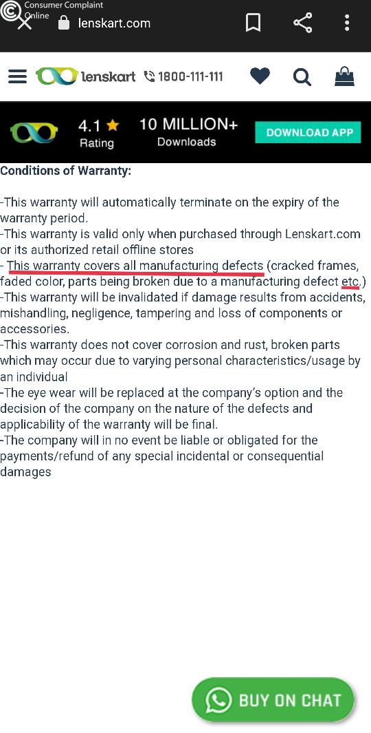 People purchase from known brands due to their quality assurance but these big brands cheat bonafide customers by selling substandard and/or defective product. These sellers cannot be allowed to take advantage of their own wrong of selling substandard and/or defective products and then shirking their liability of exchanging such products by putting clauses like "warranty won't be applicable if a spare part is missing". If the manufacturer/seller doesn't provide spare parts of the product they manufacture/sell then who else will? This devious strategy of Lenskart of forcing its customers into buying new specs from them by not repairing the previous specs has to be nipped in the bud. Despite being a bonafide customer I have been troubled to great extent, twice I have been given products that had some or the other manufacturing defect, I had to tighten the screws of my specs which was a tedious and difficult task as the screws were too small, I had to make multiple visits to the Lenskart store, I made several follow up calls etc., all this has caused me immense mental and financial harrasment.