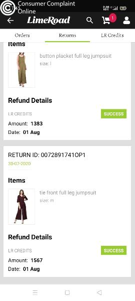 I ordered the some clothing products on 26-8-20, I sincerely waited for the product delivery, but finally not delivered, they itself cancelled the order, on 13-9-20 amount is reflected to limeroad account and from their they took google pay direct transfer. But I didn't received the refund amount. Kindly help me to get the amount