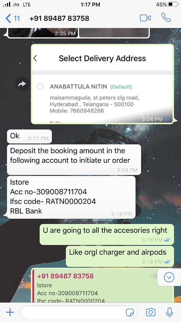 online through WhatsApp and Facebook. I the undersigned was purchasing a Mobile phone ( Apple