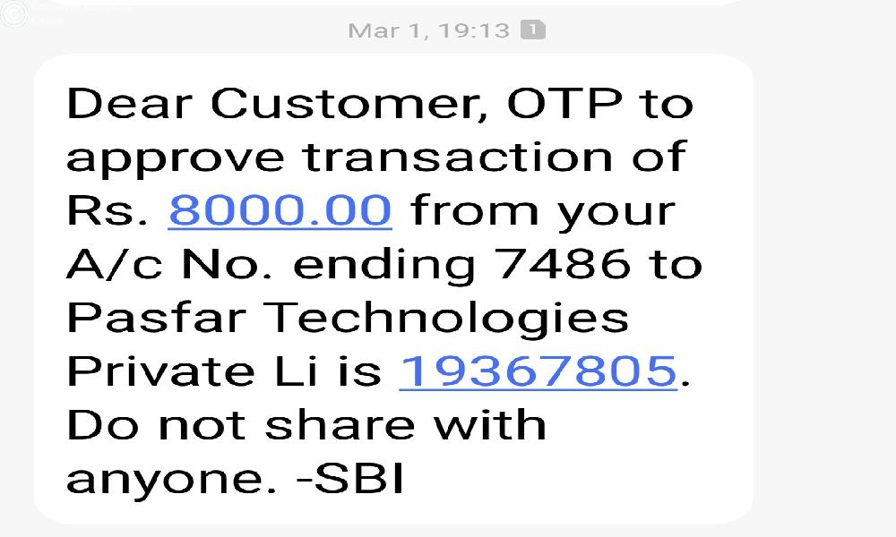 Dear Customer, OTP to approve transaction of Rs. 121000.00 from your A/c No. ending 1244 to Pasfar Technologies Private Li is 60512051. Do not share with anyone. -SBI