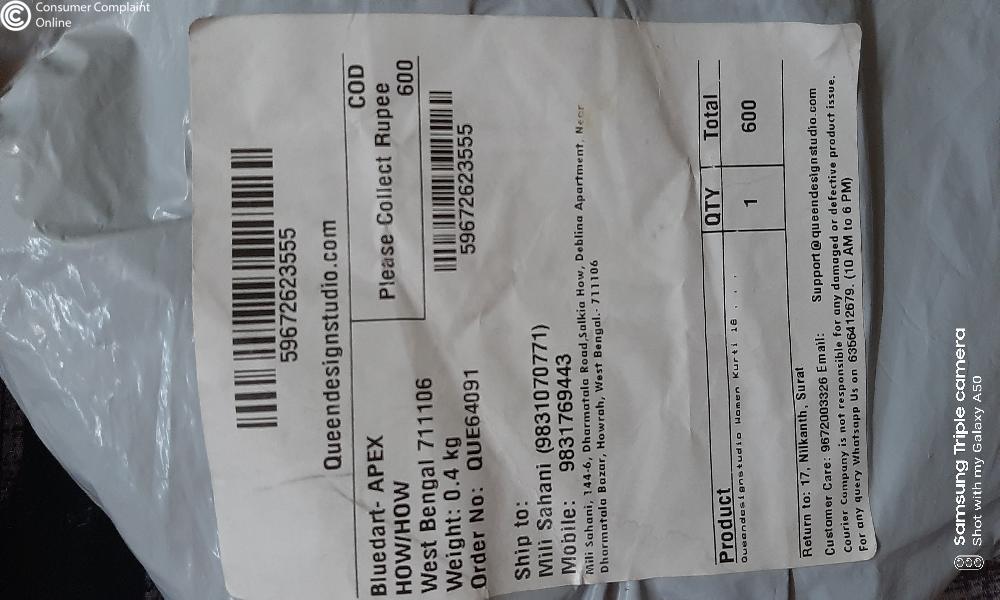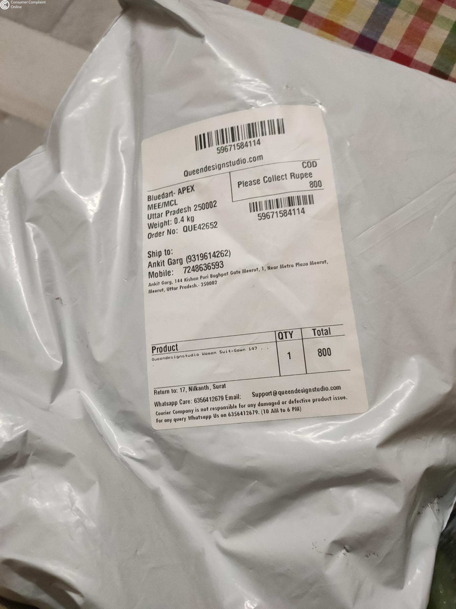 I ordered a indo western dress from queen design studio site worth 800 rs. I received wrong and damaged piece of saree. I fill the form for return and refund request in site but no response. I want to complaint against queen design studio site. And refund my money