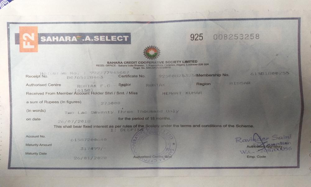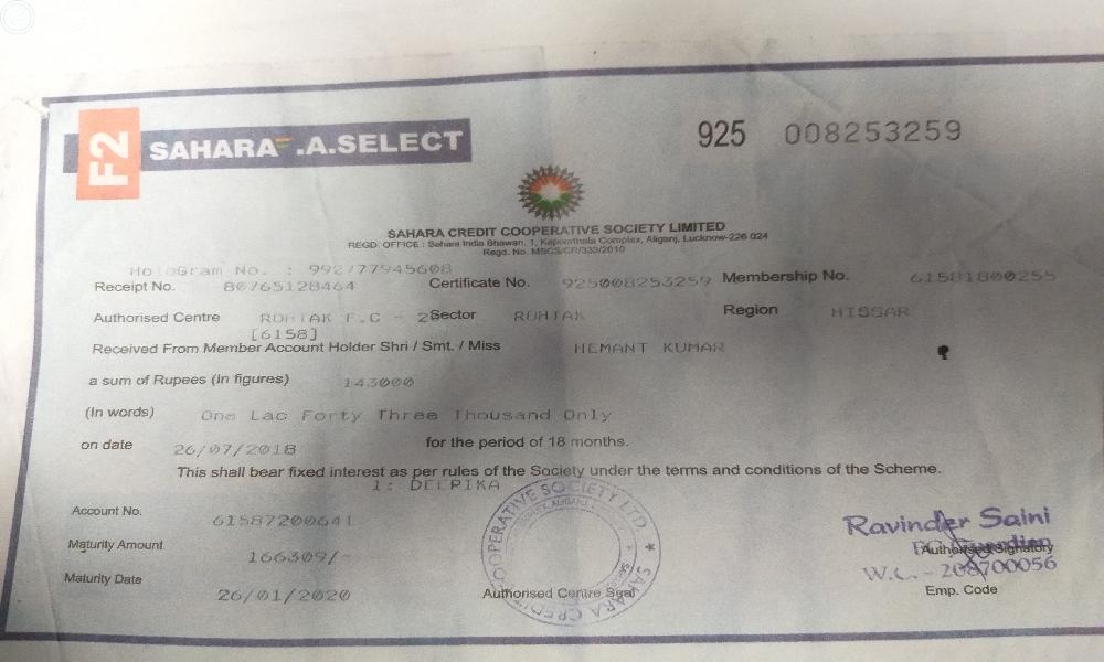 I ,Dr Raghavendra Kulkarni Bidar Karnataka state India,belongs to a middle class family. Deposited my hard earned ( land sold) money in sahara credit cooperative society.My elder brother( 30lakhs) my senior citizen mother aged about 85 years .(30lakhs) and myself (30lakhs) invested all three independently but the promise was to give 15 int monthly interest. But after couple of months sahara stopped giving it from there onwards we r struggling to get our money back.but sir that commitment was for one year .but they forcibly renewed for 18 months again . unecessary torture .Some 15 lakhs Fixed deposit matured 2 years back.they are not ready to repay it. And telling that our q shop and housing case is in court,so our money is strucked But sir which is not related to this case.