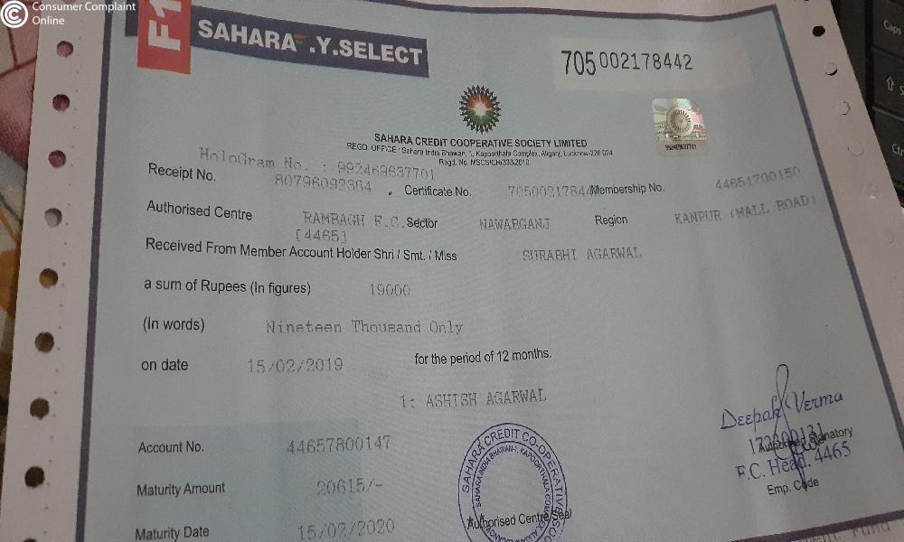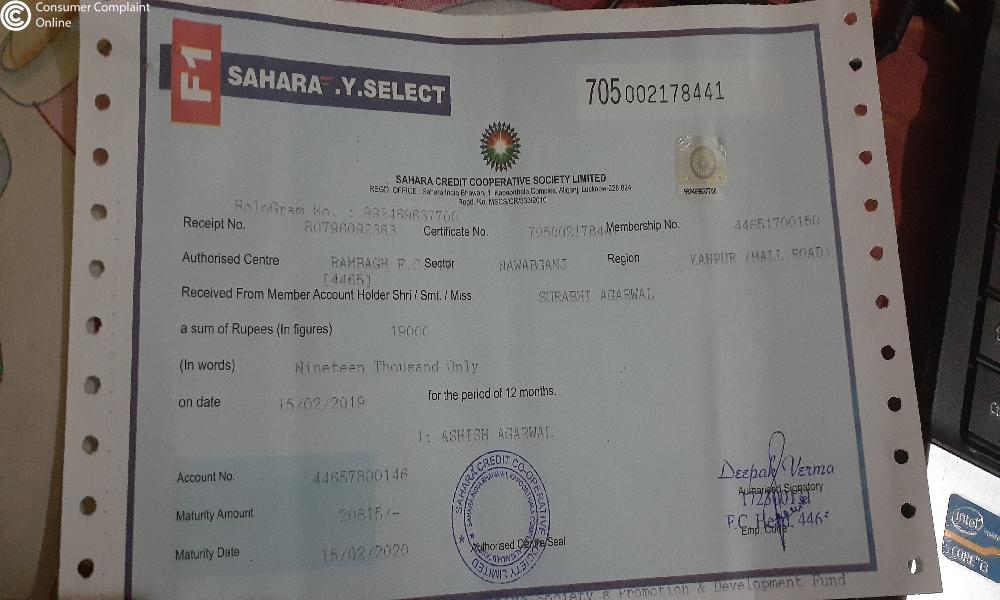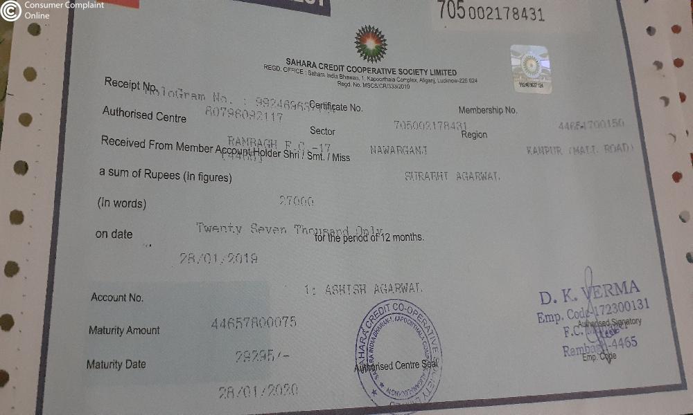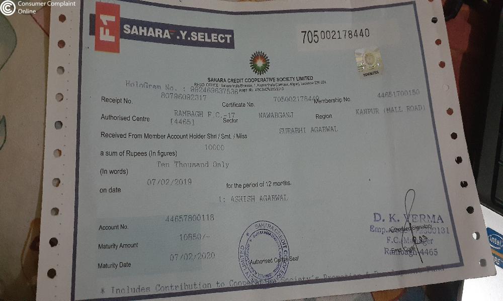 I HAVE INVESTED A SUM OF RS.1,86,000/- IN SAHARA A.SELECT F2, VIDE RECEITP NO.-80801967331, CERTITICATE NO.-925006075665, MEMBERSHIP NO.-58301500374, ACCOUNT NO.-58307201416 AT AUTHORISED CENTRE PADMAPUR F.C.-1 RAYAGADA ON DATED 31-12-2018 AND AS PER THE TERMS OF THIS DEPOSIT IT IS MATURITY DATE WAS 30-06-2018. AND AFTER COMPLETION OF MORE THEN ONE MONTH I AM UNABLE TO GET MY MATURITY AMOUNT, HOW AND WHEN WILL I GET MY MATURITY AMOUNT OF THE AFORESAID DEPOSIT.