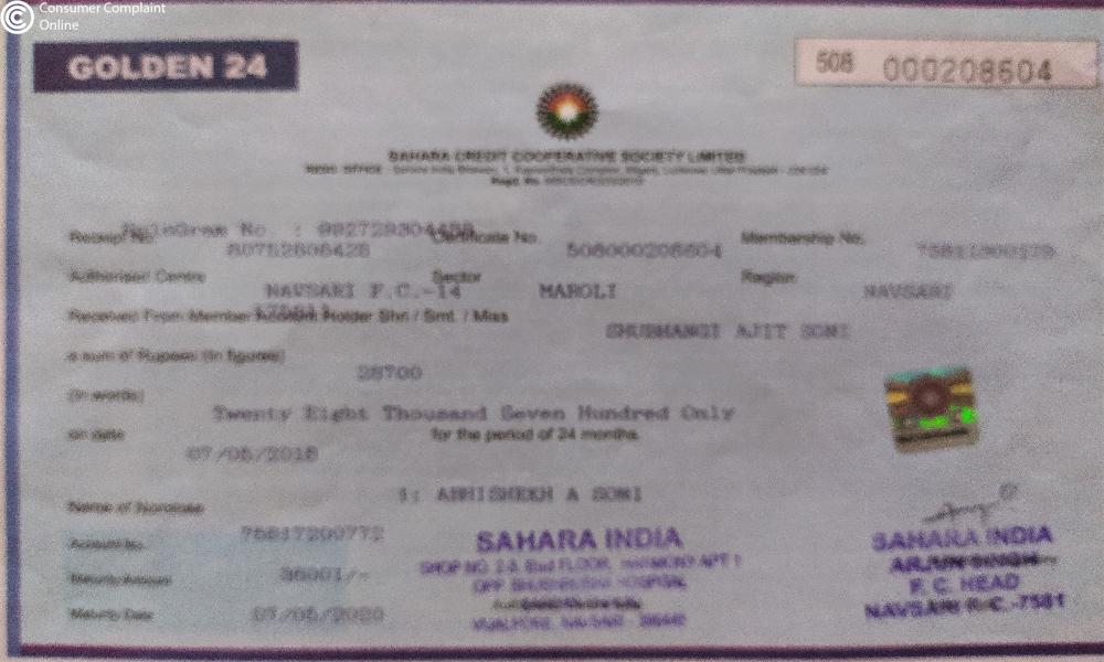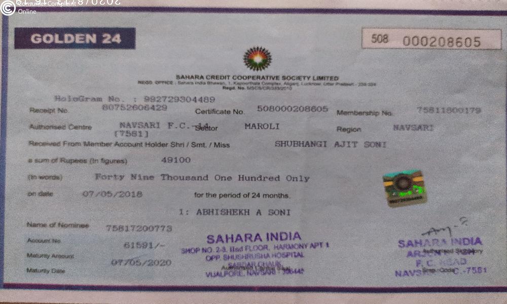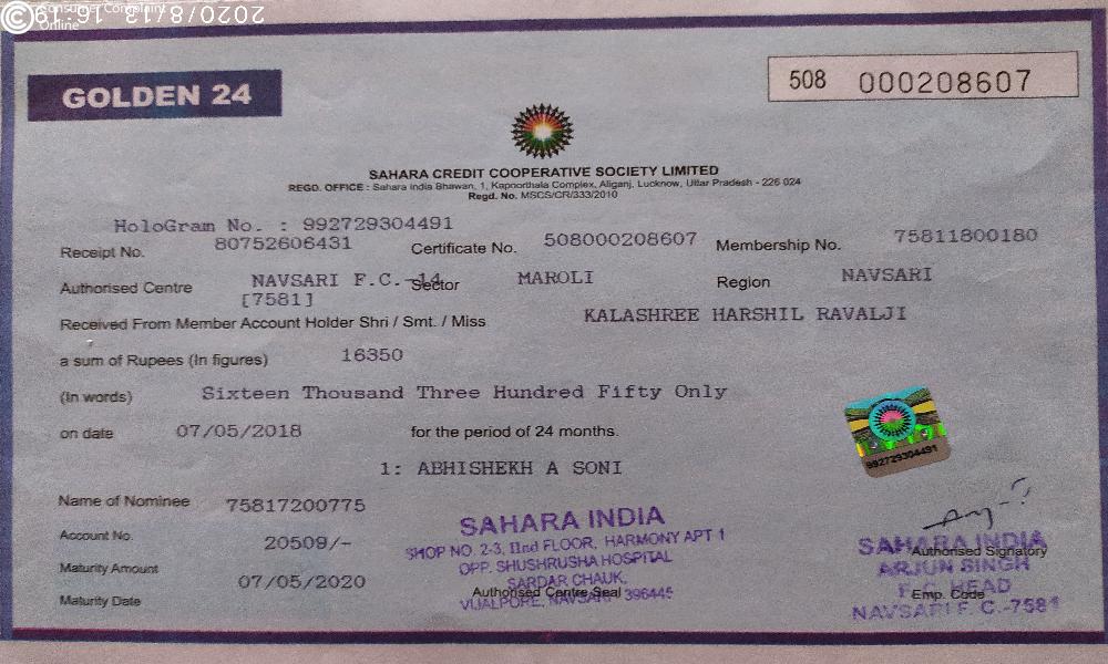 I undersign Ajit B. Soni, my wife Shubhangi A. Soni and my daughter Kalashree H. Ravalji are members of SAHARA CREDIT CO.OP. SOCEITY. We have our F.D.s, namely GOLDEN 24 on our names. All our F.D.s are matured on 7Th may 2020.