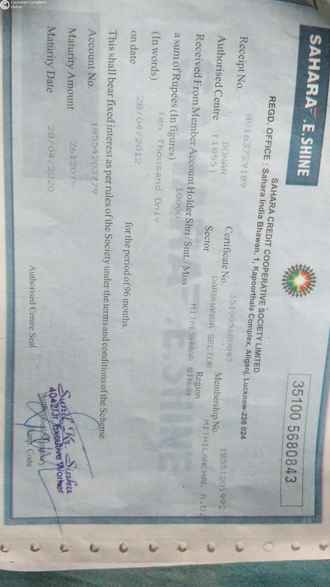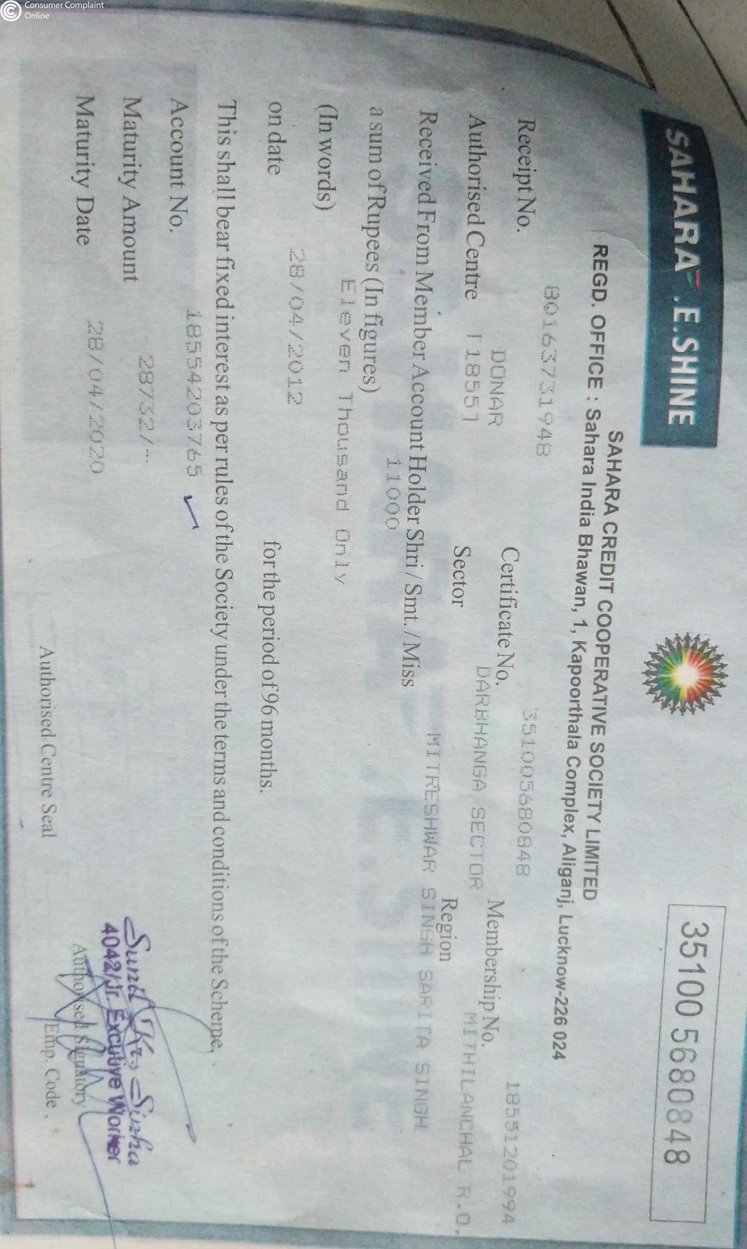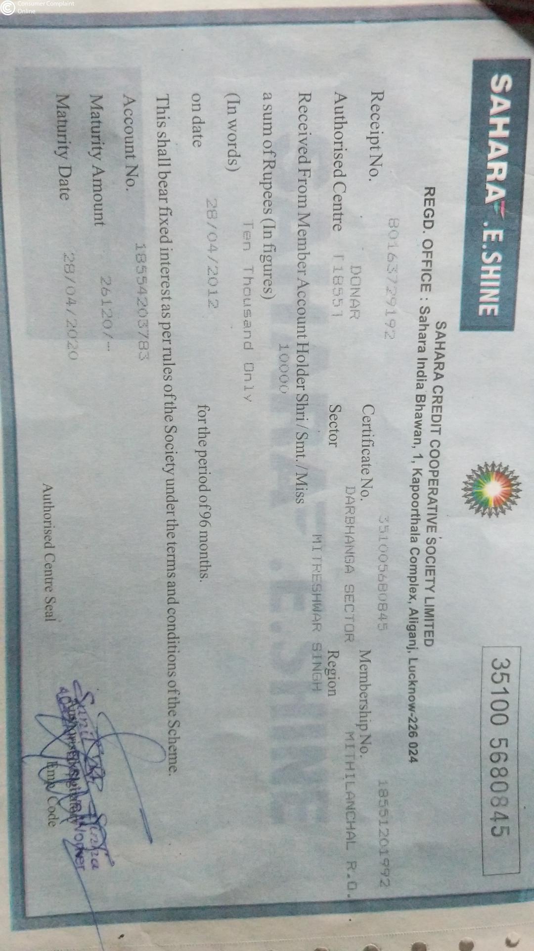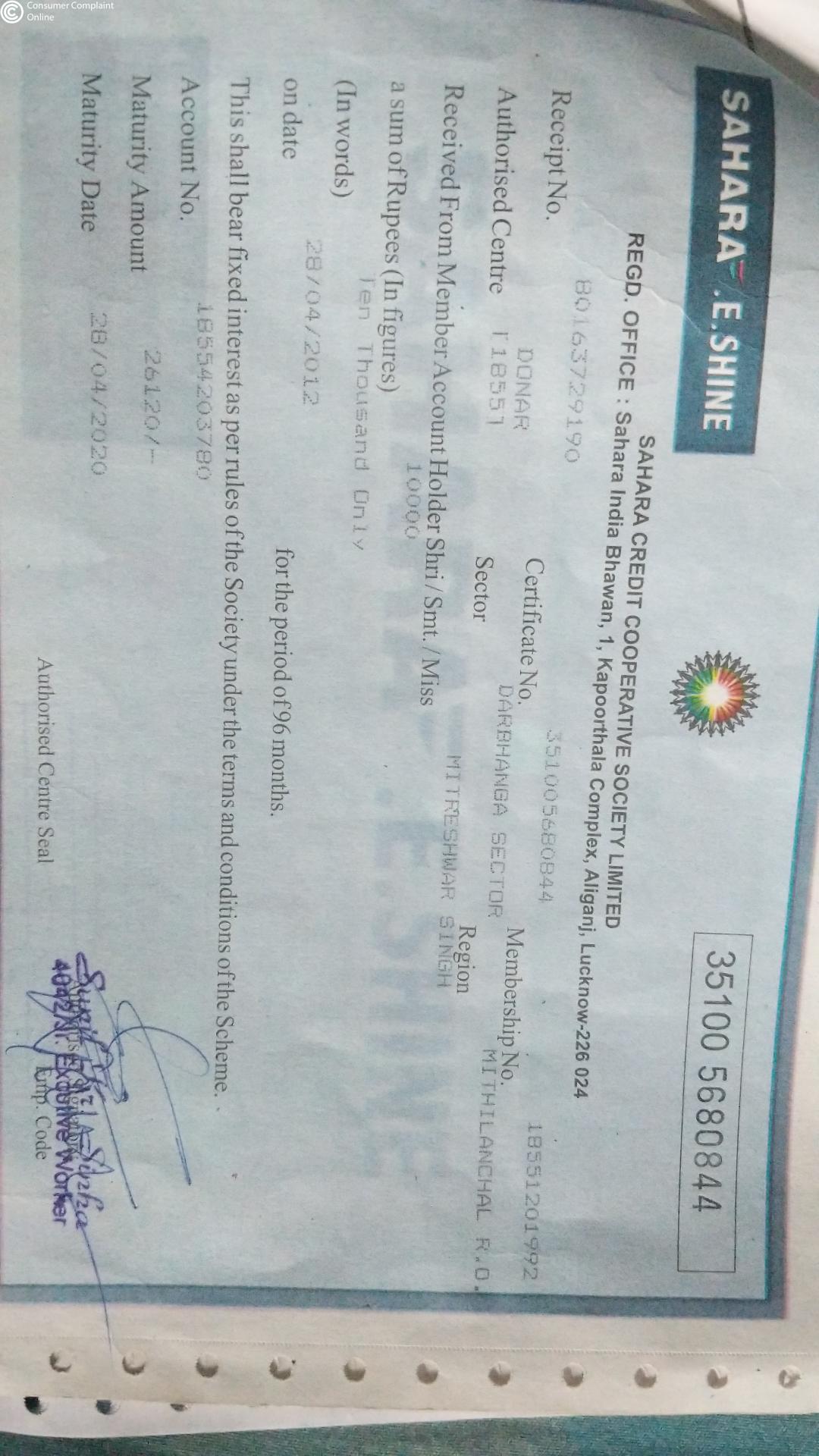 I have a fixed deposit in Sahara credit cooperative society under E-shine scheme since 28/04/2012 and it's already matured previous years 28/04/2020, but the company don't release my money till date and while I communicate with branch manager and they filled up the claim form from me and said that your money will come within 15 days, but 45 days gone now I have not been given any information, no one is telling me when my application money will come, I have already requested for the demand money.
