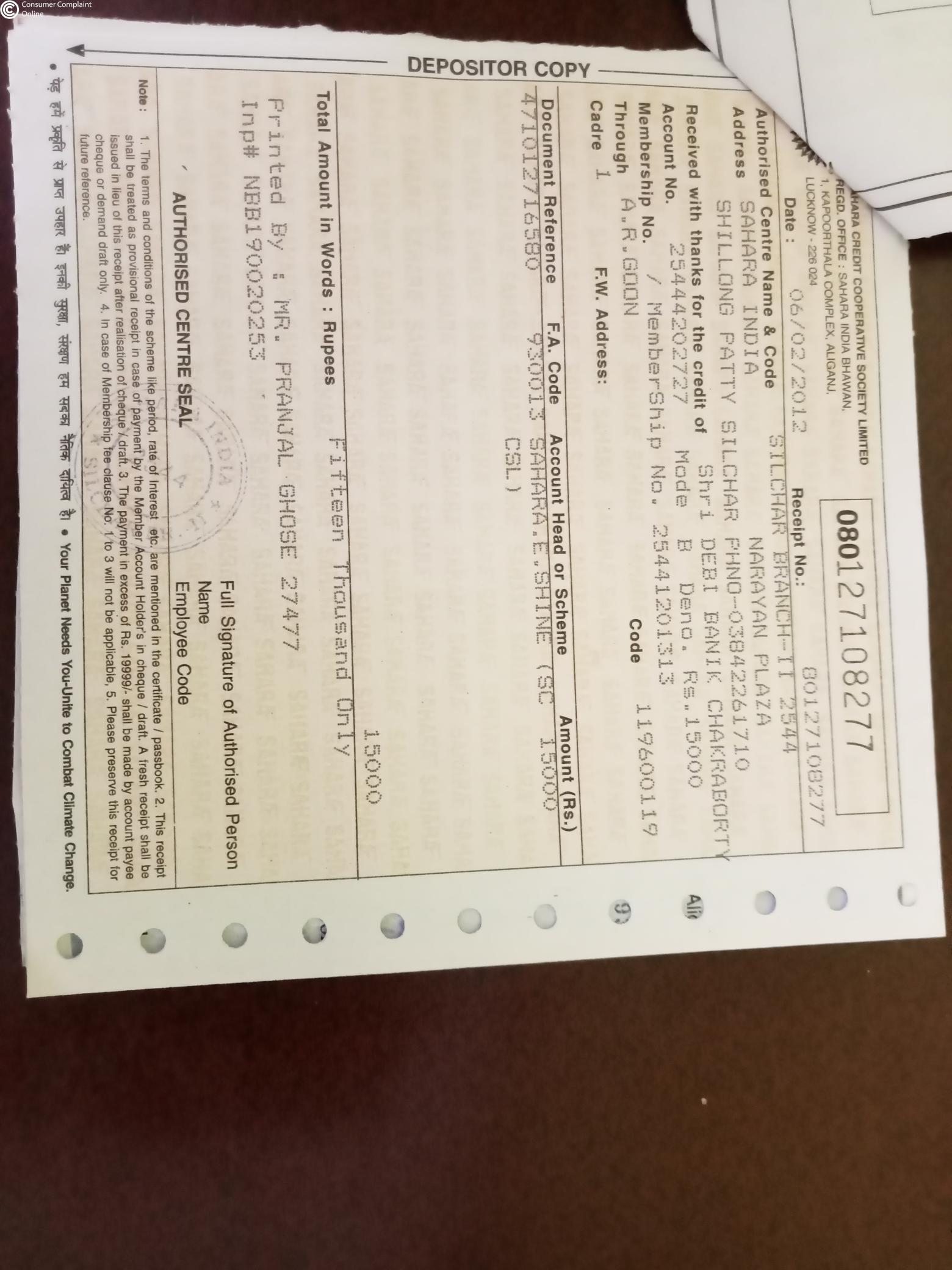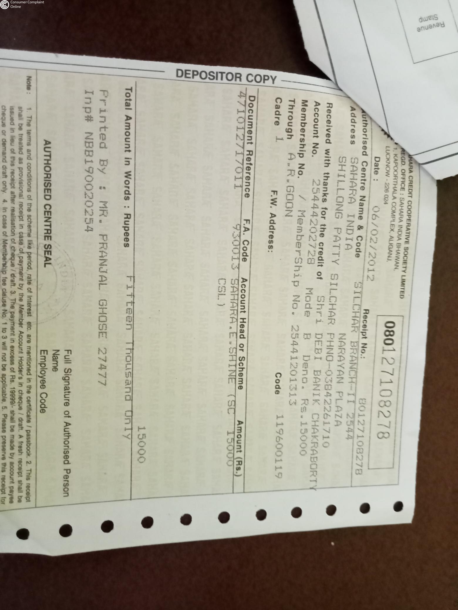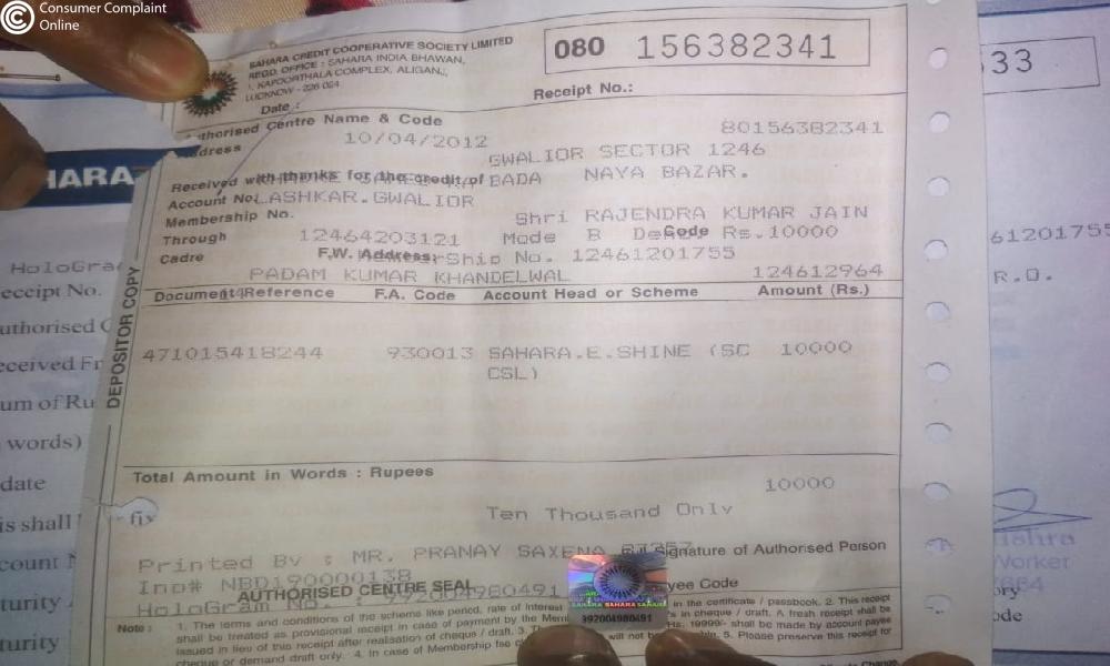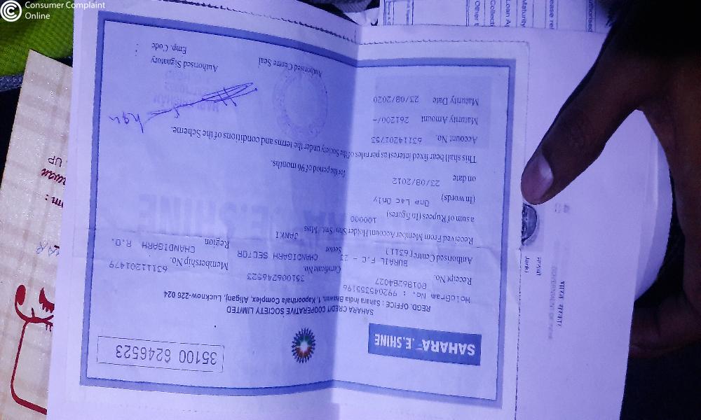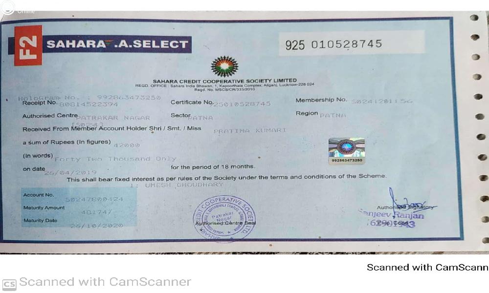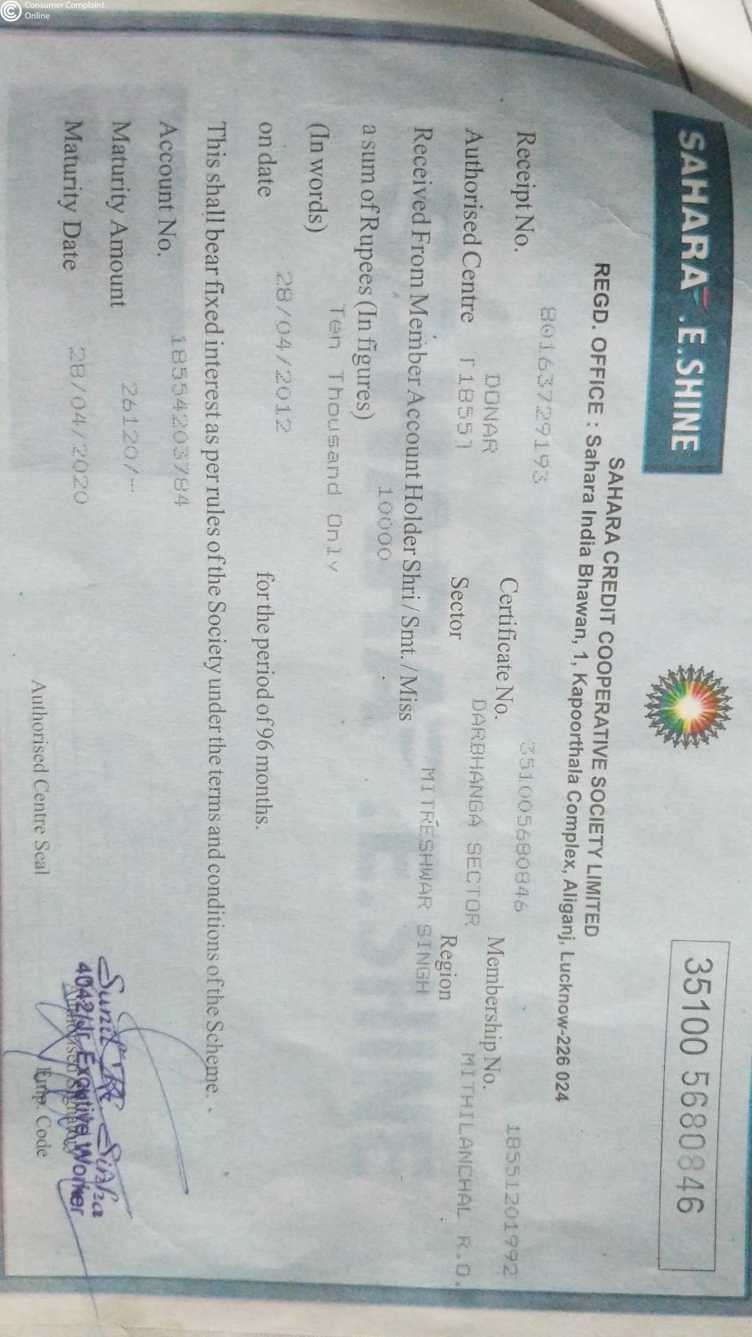 I have a fixed deposit in Sahara credit cooperative society under E-shine scheme since 28/04/2012 and it's already matured previous years 28/04/2020, but the company don't release my money till date and while I communicate with branch manager and they filled up the claim form from me and said that your money will come within 15 days, but 45 days gone now I have not been given any information, no one is telling me when my application money will come, I have already requested for the demand money.