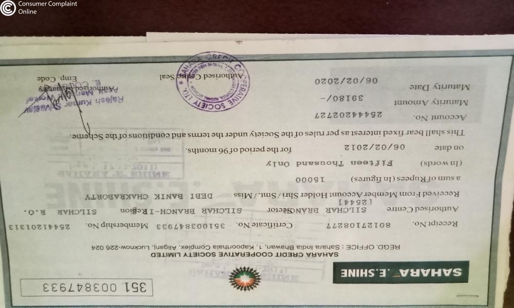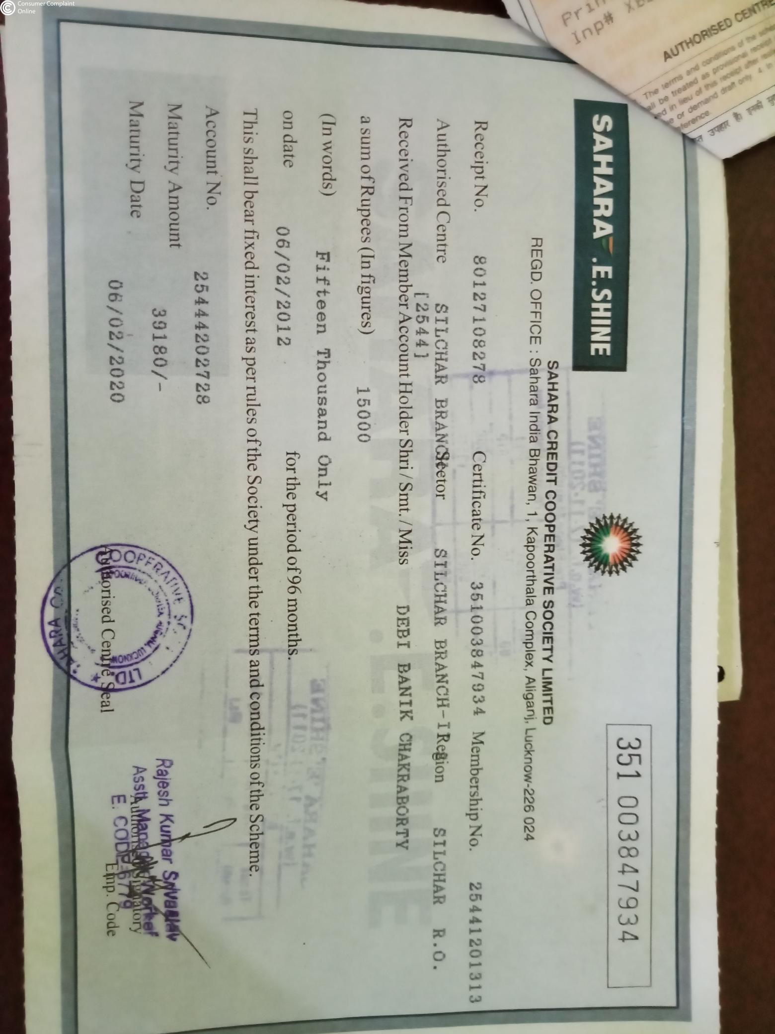 1.My SAHARA.E.SHINE Certificate Number 351003013617 amount Rs.15000(fifteen thousand only) 24-12-2011. which was matured on 24-12-2019 maturity amount Rs. 39180 ( Thirty nine thousand one hundred eighty only) till date no payment made.