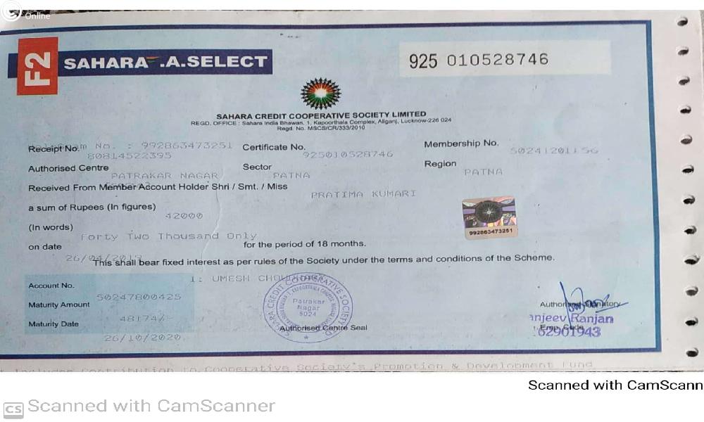 But when my parents went to their Sahara's Kharar office (Punjab) around 1 year back to get this FD encashed, the sahara people told them that they can not pay the amount as their cases are going on in Supreme Court.