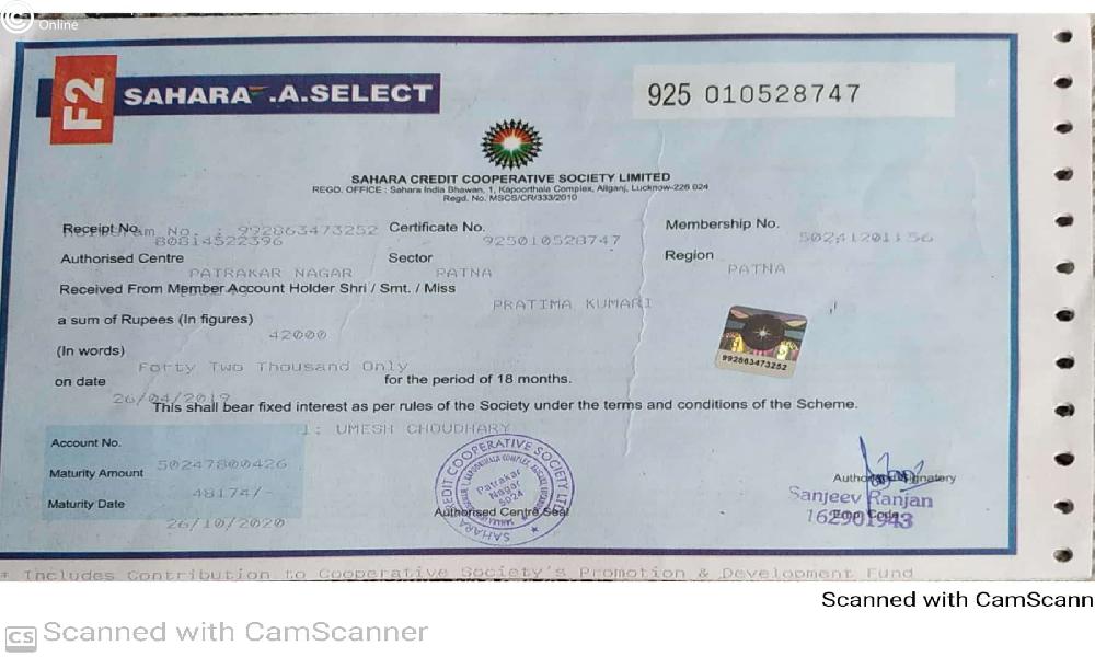 My wife, Chetanaben Kalani has deposited Rs 130550 as on 19th Sept 2018 for 2 years through her Membership No 44471800293 and it matured as on 19th Sept 2020 but still She did not get her maturity amount from Sahara Credit Co Op Soc.