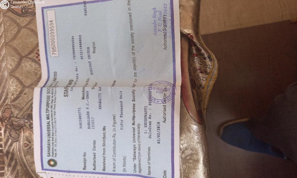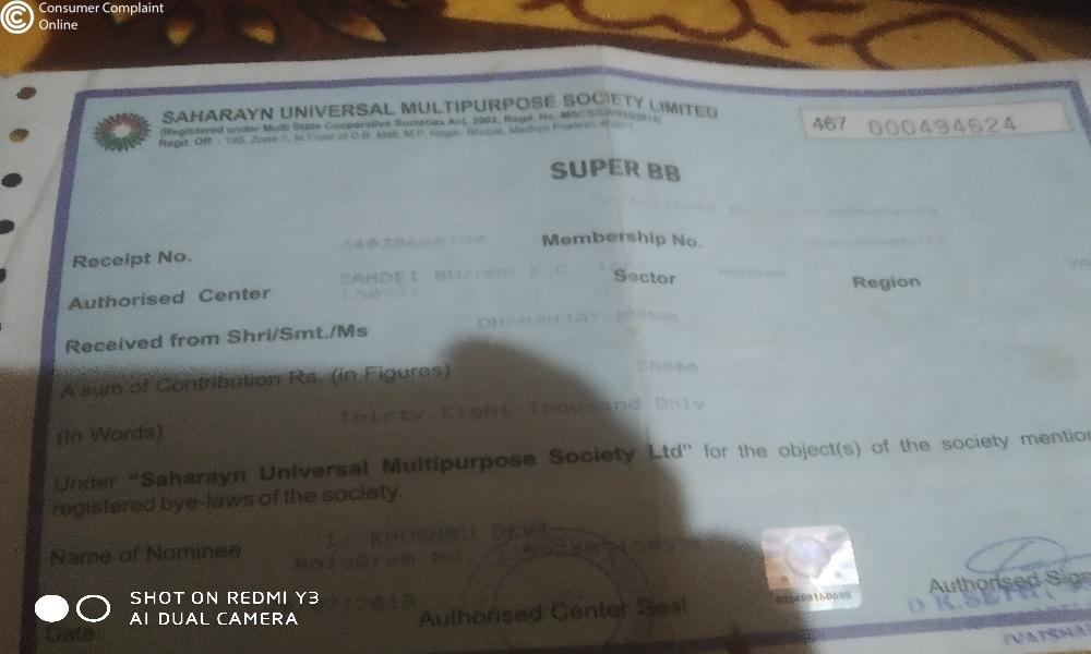 Certificate number-467000494624, Receipt number-34038660190, Membership number-950938000216 in sector-mahnar, Authorised center-sahdei Buzurg F. C-1603 (5093), Sector-Mahnar, Region-Vaishali, sahara india branch but sahara not given my maturity.........