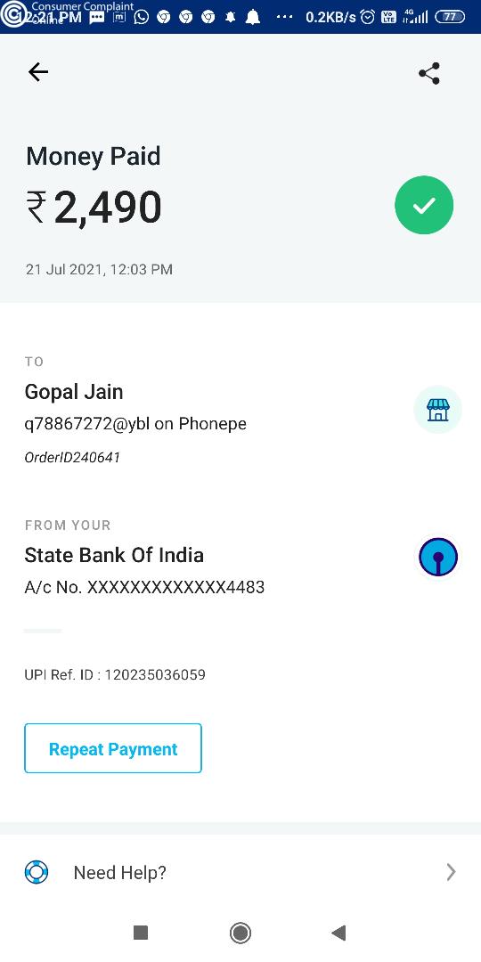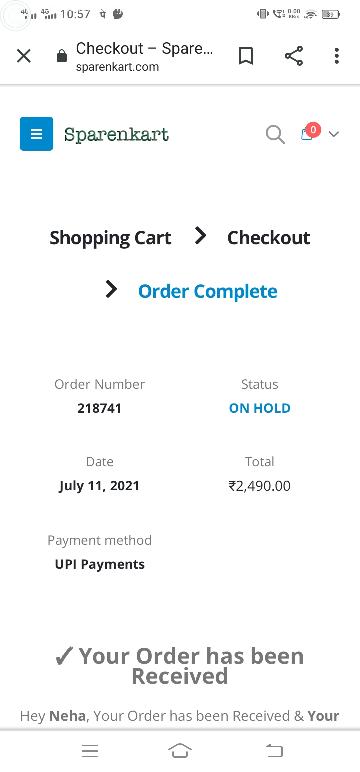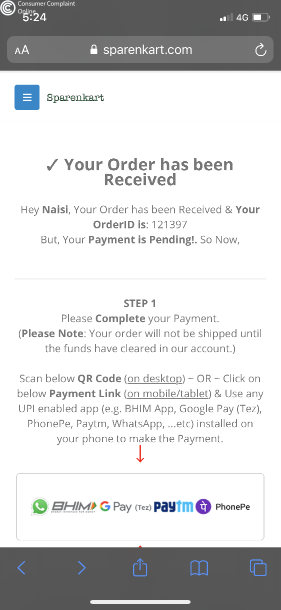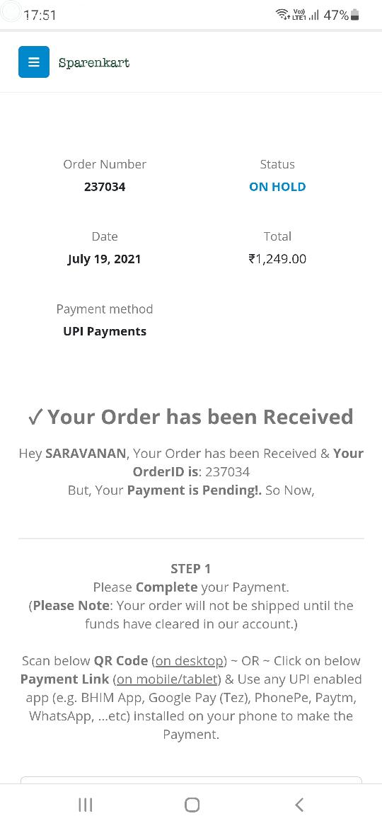 I have ordered Oppo Mobile Phone costing Rs. 1249/- from sparenkart.com website dated on 02.07.2021. and I also paid the amount Rs. 1249/- through Phone Pay. Amount is also detected my bank account. But I have not got any conformation messages their website. and their Customer care helpline number is also Switched off. So, i think this online fraud. Please help me.