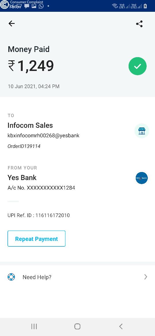 I have made payment but till now no response ihave sent mail the number given is not in use ior switch off the upi payment done in favour of infocomsales