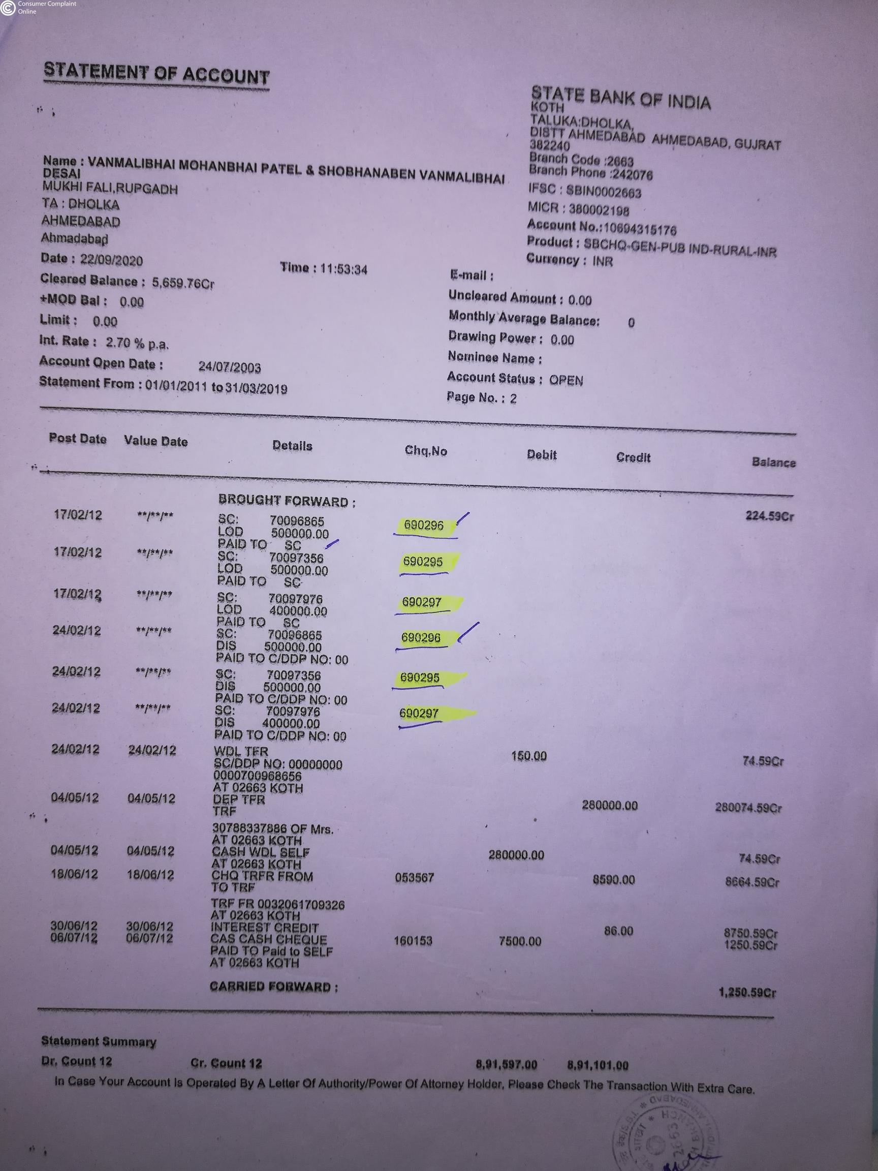 For these, we visited the branch approximately 9 times but manager doesn't respond and cooperate us. Hence we have to lodge complaint against the SBI Koth Branch, taluka. Dholka, Dist, Ahmedabad.
