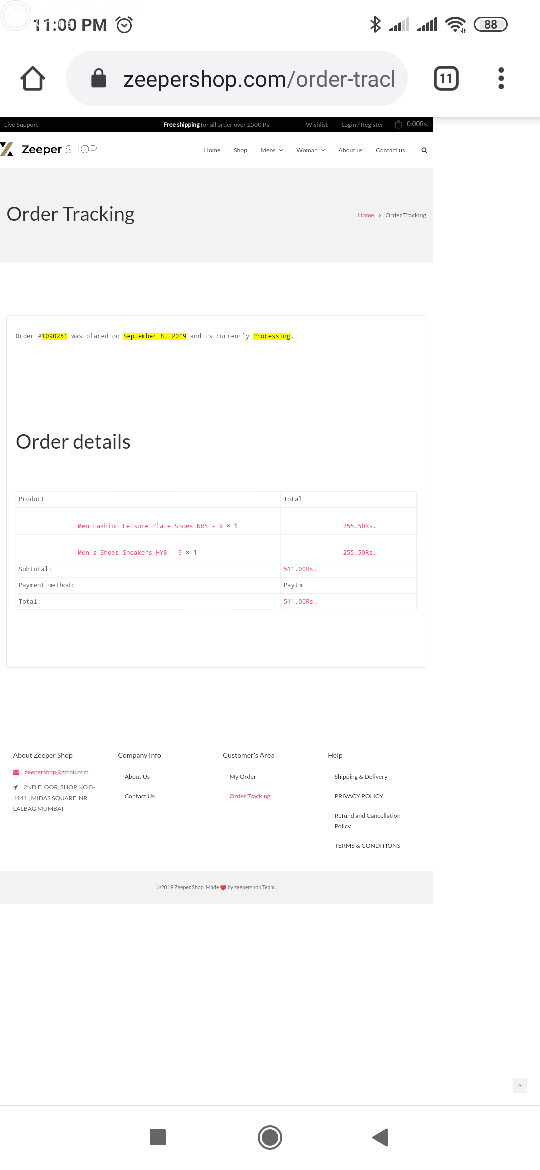 I was order men fashion shos from Zeeper. Com on dated 05/09/2019 on same time I was paid the amount online and same time my A/C is debited shos cost but still not yet receive the matterial. I have continued mail zeepershop@gmail.com. but nothing replay kindly look the matter i think this company is faurd company. they cheating the customers in online. pls taken a step.....and refund the amount